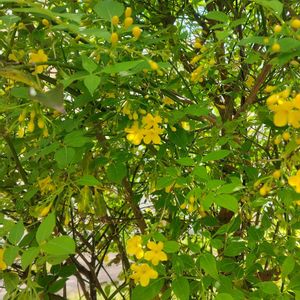 半月程前の様子 カロライナジャスミン💛の花と モッコウバラ🤍の葉が絡まりあって 綺麗です。 モッコウバラもカロライナジャスミンも 殆ど何もしなくても 毎年恒例で咲いてくれます。 が ジャスミンもモッコウバラも 花後が 大変何です😵 早めにカットしないと 庭中花が落ちて大変な事に……… 山野草等の上に落ちるので………
