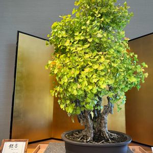 《銀杏の盆栽》 ときどき訪れる場所に、素敵な盆栽が飾られています。 樹齢45年だそうです。 青々した葉っぱの銀杏の盆栽、初めて見ました👀