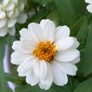 ♡ジニア白 鉢植えジニア、連日の暑さにもめげず元気に咲いてます🤗 種からの苗は蕾はあるけどまだ咲いてくれない。待ち遠しい😅