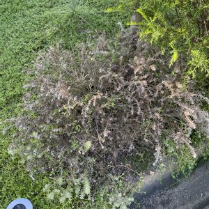 たまには失敗も成功の基という事で… ウエストリンギアスモーキーホワイト 台風🌀来る前に猛暑で下葉を残して殆ど枯れ込んでしまった…ずっと雨降ってなかった。 もう少ししたら大雨だったのにね☔️ 他の場所に植えてるのはアガベと一緒に水やってたから元気なんですが地植えでもこれだけ暑いとダメなんだね…隣のグレビレアは平気そうなんだがウエストリンギアってもしかして気難しいのか? 蒸れかとも思ったけど透かし剪定もしてたし1番蒸れる下葉が大丈夫という事は水不足かと、かなりの大株だっただけにショック😨 下葉が大雨後に生き生きしてるから時間かかるけど復活するとは思います🤔