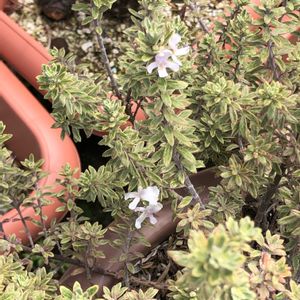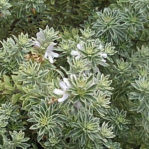 ウエストリンギア・モスキーホワイトでしょうか? 春になると白い花が咲きますと書いてありましたが、昨年咲いてくれませんでした。 今年は冬も外に出してみました、どんな花が咲くのか分からないままでしたが、可愛い花でした、 咲いてくれました😂😄