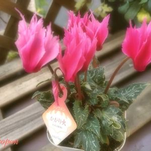 こんばんは(๑•᎑•๑)♬* 昨日、パンビオさんと一緒に届いた珍しい花形のシクラメン・かがり火さん🌼 埼玉県の花越さん生産のシクラメンさんでは珍しい3号ポットサイズのギュッとしまった良株です😃︎💕︎ ほんとにかがり火みたいで可愛い◝(⑅•ᴗ•⑅)◜..°♡ 葉っぱの形もギザギザしていて素敵なんです♡(⑉︎• •⑉︎)♡ᔆᵘᵗᵉᵏⁱ♡ ☘️✽.。.:・゚ ✽☘️✽.。.:・゚ ✽☘️ 早速、この子を使って寄せ植えを作りました(*´∀`)♪ ミュールミルさんの可愛いバスケット🧺に、合わせたリーフ🌿はヘデラの雪ほたるさん、ウエストリンギアのスモーキーホワイトさん🌿 シンプルながら可愛いひと鉢に(๑•ᴗ•๑)♡カワイイ♡