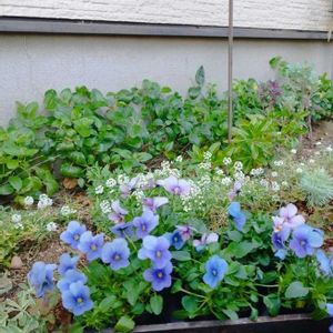 大好きなブルーの寄せ植えです。 使ったのはパスフリ淡青、 パピヨンワールド、丸森ビオラ。 花の形、大きさの異なる品種を集めました。 丸森ビオラ可愛すぎる〜💦