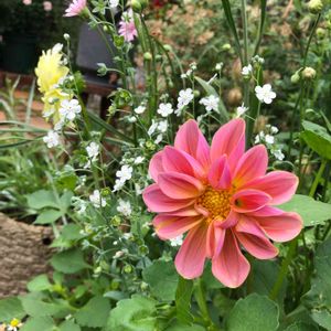 ダリアがとても綺麗に咲きました🌸 初めて種から育てました😊🎶 種まきっ子たちで寄せ植えに💕 ダリア、オンファロデス・リニフォリア、桃色たんぽぽ🌸 種から育てた子たちは愛着が増しますね😆⤴️✨