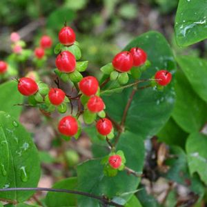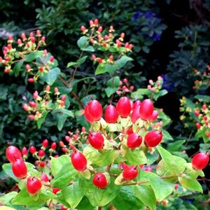 ヒペリカムの色づいた実 小坊主弟切(こぼうずおとぎり) 可愛らしい果実を実らせています。 果実の色 赤、クリーム、ピンク