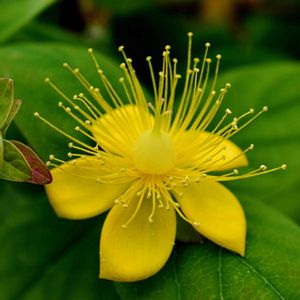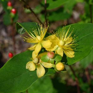 ヒペリカム/小坊主弟切(コボウズオトギリ) オトギリソウ科オトギリソウ属の半常緑低木。花期は6~7月。ビヨウヤナギ、キンシバイをはじめとするヒペリカムの仲間は、梅雨時に鮮やかな黄色の美しい花を咲かせることで人気の花木。庭木としても多く利用される。花は小さめだが実が大きく美しいコボウズオトギリにもたくさんの園芸品種があり、多彩な実の色がある。 名前のヒペリカムは属名の音読み。属名はギリシャ語Hyper(上)+eikon(絵、像)に由来する。古代真夏の祭典で、悪魔を撃退するのに像の上に置かれたことにちなむという。 出典『散歩で見かける街路樹・公園樹・庭木図鑑』『由来がわかる 木の名前』