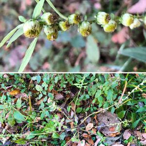 🌿ヤブタバコ(薮煙草)🌿 城址公園の草むらの中で見つけました。 茎の途中で数本の長い横枝を放射状に伸ばした姿が特徴的で、初めて見るヤブタバコです。 黄色の頭花(0.6㎜くらい)が下向きにずらっと並んでついているので、ひっくり返して撮りました。 キク科 ヤブタバコ属(ガンクビ属) 花期: 9〜10月 花言葉: 「助け合い」「豊かな感情」 名前の由来: タバコの葉に似ていることから。 ※よく似たガンクビソウは枝先に花が付きます。 痩果は熟しても冠毛は無く、独特の臭気がある。 粘着性があるので「ひっつき虫」に分類されます。