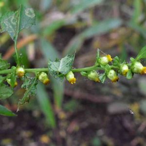 ヤブタバコ 藪煙草 上部の葉は長楕円形で、上のものほど小さい。上部の葉腋に黄色の頭花を下向きに1個ずつつける。 名前は下方の葉がタバコに似て、藪地に生えることによる。