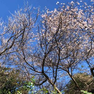 狂い咲き。先週の桜か梅か?🌸 は、桜だとわかりました。 今朝はスキッとした青空。 収穫期のみかん🍊と桜の共演😁