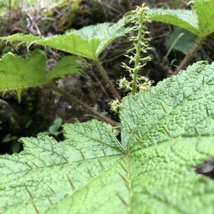 ハリブキ(針蕗) よーく見ると 大きな葉っぱに針が出ています 蕗と言っても立派な木 白っぽい花が咲いて果実は真っ赤 深山の針葉樹林で見かける自己防衛力の強い植物です