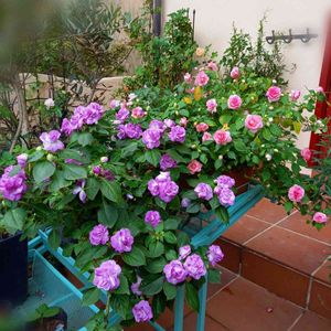 挿し芽の八重咲きインパチェンスの お花が大きくて薔薇みたい🌹 5㎝位あるかな😅 バーベナの色が鮮やかに なってきました 秋ですね〜🍁