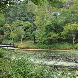 雨が降ったり止んだりの 軽井沢レイクガーデン(*´ω`*) 緑が美しい〜💚 湖面にはアサザがたくさん咲いていました〜💛 レイクガーデン花散歩①