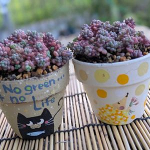 最近、あちこちでポット販売されてる パープルさん 近くの花屋には無いのでインスタ販売タイムリーにポチれました セーフ🤭 ハルちゃんの猫🐱鉢と イズミちゃんの花ネズミ鉢にそっと植え替えました そして朝から脱力猫🤭