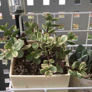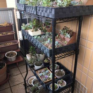 夏の中庭。棚1。 出来るだけ朝日と午前中の優しい日光に当てるように、中庭の東側に棚を並べる。 カリの夏日は日差しが非常に熱く焼き照らすので、夏は多肉のプリプリ肌を焼いてしまわないように、お昼と午後の直射日光に当てないよう気をつける。 去年はそれが分からず、カリの太陽☀を甘く見ていた。 何枚も葉が焼かれてしまった。