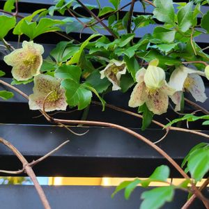 クレマチス ‘日枝‘【冬咲きクレマティス】 1枚目、5枚目は開花時の様子 クリスマスローズの様な花が咲きます 2枚目は全景 3枚目は蕾 4枚目は開花後 蕾が付いているので未だ咲いてくれそうです