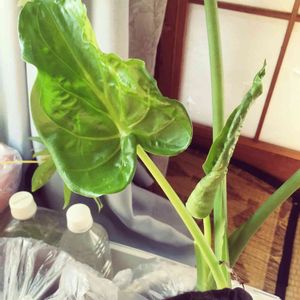 クワズイモさんの新葉も出ました。下の黒いのは猫の顔です。笑