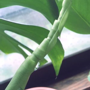 モンステラの新しい巻き巻き新葉!! 今度はどのくらい割れるかな…