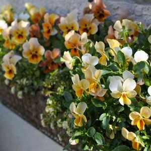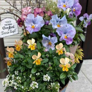 おはようございます☀️😃 寄せ植えのビオラの金茶さん、ハニーマスタードさん、そしてアリッサムさんが何やらお話し中~🤭 素敵な日曜日を~(⌒0⌒)/~~
