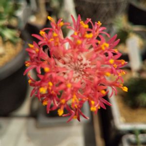 セネキオ サギナータ セネシオ サギナータス ……七宝樹を太らせて尖らせた感じ…って〇ップさんが上手く表現されてました🎶 ボディの模様がイタズラ書きっぽくて……葉は紅葉してピンク💗 足元に子株💕3つに増えてる🎶 そして…やっと開花しました〜✨ 真っ赤❤️ 小さな花の集合体で上から見ると花火みたい ◌*⃝̥*❊。☸ 𐩕