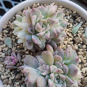 プロリフィカ錦3兄弟😊 兄弟揃って御目見は初めてですね✨ ⬆️兄弟というよりはこの子がママンです😅(2/17up)圧巻の子吹き💦群生株にしようと思います。夏ツラいかな〜? ↘️この冬をママンと一緒にずっと外で耐え抜きました💪このあと子株を離します✨ ↙️冬を屋内で過ごし、最近外デビューしました(1/7up)色白で、紅葉は厳しいかなと思ったら葉先だけポッと色付きました🥰