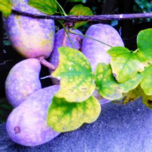 今日のお花 アケビ お花がなかったので、以前撮った朝の散歩道で見つけた、通り道のお宅の塀に蔦って這っていた、もう食べ頃のアケビを投稿します。