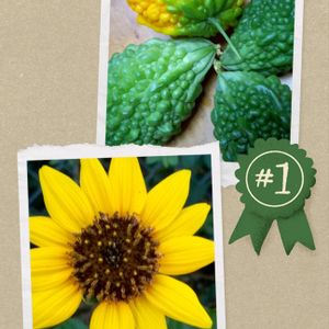 手のひらに収まる大きさのゴーヤ 油断すると直ぐに熟して黄色になります💛💛 二人暮しには この大きさで十分です ゴーヤ料理のレパートリーが少ないので 丁度いい数 小さなヒマワリにも元気貰いました🥰