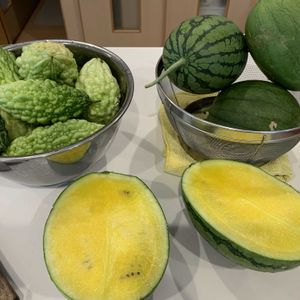 秋どりのスイカとゴーヤです。 スイカは接木苗で一旦は収穫を終え新しい芽から実りました。
