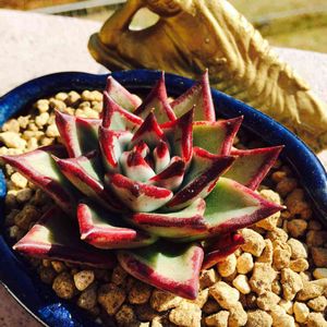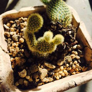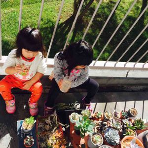 サボテン相談室戦利品! 娘が土いじりして遊んでる時に、初めて植えた子をサービスしてくれた(●´ω`●) アエオニウム系の何か。 ハウス内で落ちてたのをタニパトして見つけてきたみたい(笑) 娘ちゃーん!いじくり回した土が粘着質で水はけ悪いよぉー(笑) お水大好きな子だけど、根腐れ心配。 せっかく一生懸命植えた子だから、我慢してもらおう(笑)