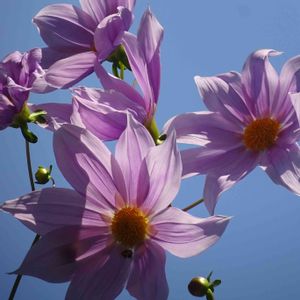 皇帝ダリア(コウテイダリア)/木立ダリア(コダチダリア) キク科ダリア属の多年草。原産地はメキシコやその隣国のグアテマラを中心とした中南米の亜高山帯。標高1300〜3800mの岩がちな斜面の草地や林の周辺部に自生する。草丈が5m以上にまで高く伸び、茎が木のように堅くなる。花は一重咲きでピンク色。栽培種には白花もあり、八重咲きのものもある。昼間の長さが12時間30分(9月中旬から下旬頃)ほどで蕾ができ、開花まで2ヶ月余りかかるため、11〜12月頃開花する。軽い霜では枯れることはないが、強い霜が降りると枯れるため、霜が早い年は蕾が全部開ききらないうちに枯死することもある。 昔、アステカの人たちは、太い茎が中空であることから水を流すための樋に利用し、全長60〜80㎝にもなる葉を家畜の餌にしていた。 名前は、学名のダリア・インペリアリスの和訳。雄大な姿から木立ダリアとも呼ばれる。また、ダリアの名前の由来はスウェーデンの植物学者、ダールにちなんだもの。 出典『色と形で見わけ散歩を楽しむ花図鑑』『NHK趣味の園芸 ダリア』『NHK趣味の園芸 Q&A 秋』『ダリア百科』『花の名前事典』