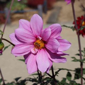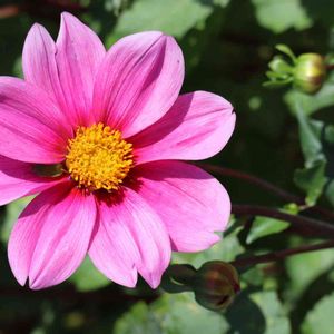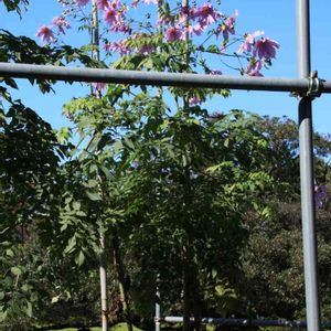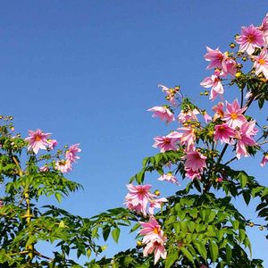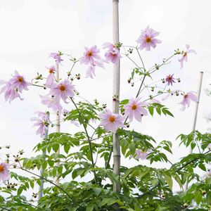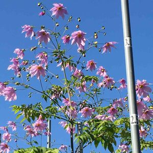 皇帝ダリア(コウテイダリア)/木立ダリア(コダチダリア) キク科ダリア属の多年草。原産地はメキシコやその隣国のグアテマラを中心とした中南米の亜高山帯。標高1300〜3800mの岩がちな斜面の草地や林の周辺部に自生する。草丈が5m以上にまで高く伸び、茎が木のように堅くなる。花は一重咲きでピンク色。栽培種には白花もあり、八重咲きのものもある。昼間の長さが12時間30分(9月中旬から下旬頃)ほどで蕾ができ、開花まで2ヶ月余りかかるため、11〜12月頃開花する。軽い霜では枯れることはないが、強い霜が降りると枯れるため、霜が早い年は蕾が全部開ききらないうちに枯死することもある。 昔、アステカの人たちは、太い茎が中空であることから水を流すための樋に利用し、全長60〜80㎝にもなる葉を家畜の餌にしていた。 名前は、学名のダリア・インペリアリスの和訳。雄大な姿から木立ダリアとも呼ばれる。また、ダリアの名前の由来はスウェーデンの植物学者、ダールにちなんだもの。 出典『色と形で見わけ散歩を楽しむ花図鑑』『NHK趣味の園芸 ダリア』『NHK趣味の園芸 Q&A 秋』『ダリア百科』『花の名前事典』