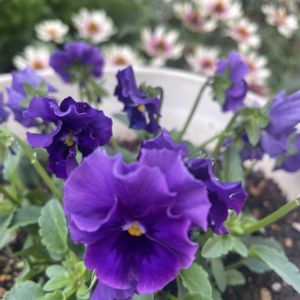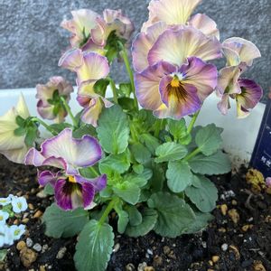 植えて1ヶ月ちょっとのビオラたち 1枚目 ミニフリ 2枚目 華あられ 3枚目 ミルフル お花の1つ1つがかわいいです✨