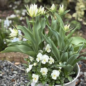 1番に咲いたチューリップは ホワイトバレー🤍✨ 2年目なのでどうかな〜🙄 と…ちょっとお花が小さいかな🙄 もう1種類植えた🌷はまだ葉っぱだけ😅 チューリップも早咲き、遅咲き あるんですよね〜🤔 でももう一度楽しめていいかも🤭 足元のビオラは ももかシリーズ みるくちゃん🤗🤍🥛✨