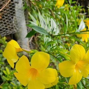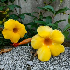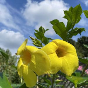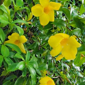 《アリアケカズラ》 半つる性常緑木本植物で、ブラジルなどの熱帯アメリカが原産🤭 鮮やかな黄色のロート状の花を咲かせ、花期は4月から10月頃です。 花言葉は「美しさ」と「陽気」です🌺🌼 宮古島にて