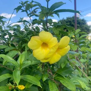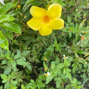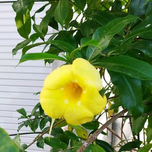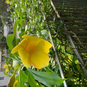 🏷️月曜ビタミンカラー アラマンダ(アリアケカズラ)が爽やかに咲いていました。 初めて見るお花でした。 (ショッピングモールの庭)
