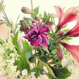 産地直売所で購入した花束に入っていた このお花の名前がわかりません🥹 どなたか教えて下さい〜🥹 …AIでモナルダと出ましたが あっていますかね?☺️