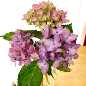 紫陽花を剪定しました 咲き始めたばかりの遅咲きの子を飾りました💕 同じ樹からなのに色が微妙に違う