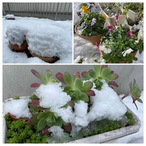 ホワイトクリスマス(イブ)が過ぎる愛知県🎄 昨日の予報で朝少し積もってるかも、、くらいの感覚で起きたら驚愕の朝を迎えました😓 ↖️今朝のお庭 よく咲くスミレの鉢。お花が見えません。 こんなに降るなら鉢達を避難させたのに、、とただただ後悔😔 ↗️午後になって晴れてきたので雪を取って日向ぼっこ中。 お花 大丈夫そうです😊 ⬇️雨晒し(雪晒し)の薄化粧とオカタイトゴメ。 午後になって雪が溶けてきた様子です。 君たちは強いからきっと大丈夫👍 気温が上がってきたので不織布を外して多肉もチェック! たぶん皆んな大丈夫!だと思う。 エケベリアのヴィーナスがちょっと怪しいので、夜だけ室内管理にしてみようと思います。 最強寒波は本当に最強でした❄️ もういいからねー💦