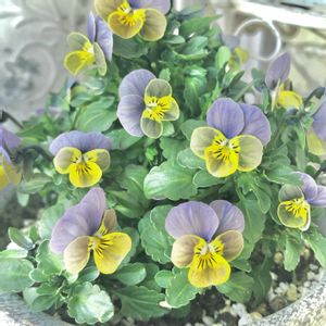 《 ビオラ 平塚弘子作品集 》 ビオレッタくらいの小さなお花で 株もコンパクトです(*'▽'*) お迎え時より紫がはっきりとしてきてツートーンに💜💛 主軸がとんがってクリスマスツリーみたいです🌲😄