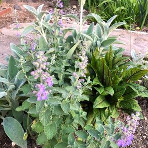 今日のお花 キャットミント 後ろはラムズイヤーと、赤筋ソレル