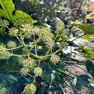 今日のお花🏷️ヤツデ❄️ まだ咲き始めのヤツデ。よほど甘いのか🐜や🐝が集まっています。 弱々しい冬の☀️暗がりに白い花が照明のようです 12月07日📸目黒の自然教育園