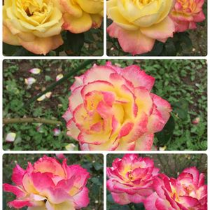 薔薇🌹 トロピカル・シャーベット 全ての写真がトロピカル・シャーベットです🎶 色の変化を見てほしくて、コラージュにしてみました😊 深みのある黄金色をベースに、咲き進むにつれて、花弁の縁が赤色に染まる大輪花です。 ティと強いフルーティーな香りがします。