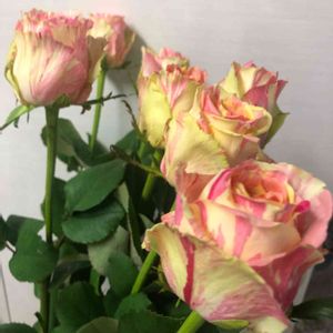 いつもお世話になってる薔薇生産者さんから~🎵 欲しいという薔薇🌹を挿し木してあげたら😄お礼にって🎵 今の時期は花が小さいけど~っていただいちゃいました🌹花束💐🌹 ピンクはオール4ラブ、赤はレッドエレガンス、絞りはフィスタ、黄色はソラーレ🌹🌹🌹 薔薇🌹の花束って嬉しいね~💓