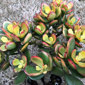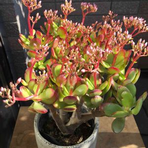 愛智園の『縁紅弁慶(花月)』。 この花月さんはクラッスラ属の多肉さんになります(*´ω`*) 花月さんはおそらく日本人にとって「金のなる木」という名前で最も身近な多肉さんだと思います! ですがこの子の正式な和名を知っている人は極々少数ではないかな?と感じます。 この「花月」、「金のなる木」という流通名で有名なこの子の正式な和名は「縁紅弁慶(ふちべにべんけい)」という名前になります(。・ω・。) また花月さんはお花が咲きやすいタイプとお花が咲きにくいタイプが存在します。 お花が咲きやすいタイプは割と小さい苗でもお花を咲かせますが、咲きにくいタイプは大きくなってやっとお花を咲かせてくれます!また咲きにくいタイプの方が葉の大きさが少し大きい気がします(*´ω`*) またこの子が「金のなる木」と呼ばれるようになったのにはいくつかの説があります。 1つ目の説は新芽が出てきたところに5円玉のような穴が空いた硬貨を通しておいて木にお金がなったように仕立てることが昔流行ったため。 2つ目の説は英名で「dollar plant」と呼ばれていてそれを訳したため。 3つ目の説は単純に葉っぱが硬貨のような光沢があるためにこのように呼ばれるようになったと言われています(*´ω`*) 育て方としてはとても強健なクラッスラ属の多肉さんなので、普通の多肉さんの育て方をしていただければオールシーズン問題ないです(。・ω・。) また花月さんは一年中屋外に放置されたままにされることが多いですが、0度を下回ると傷んでしまうことがあるのでその時はお部屋や温室に避難させてあげてください。 愛智園には約30年ほどかけて大きく成長した花月さんがいますが、生命力もすごく強いために取れた枝から写真のような新しい花月さんが沢山生まれました(。・ω・。) とても身近な多肉さんであり、すごく育てやすい多肉さんで、多肉植物の魅力を1番最初に伝えてくれている存在がこの花月さんかな?と感じます(*´ω`*)