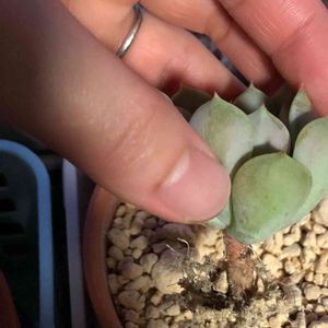 挿し芽、挿し木で 「新芽が動きだしたら水やり」とありますが… 梅雨前に根腐れさせてしまったふっくら娘さんの新芽がめちゃくちゃ動きだしたのに根っこはナシ! 前にちょろっと発根&新芽が出てきたから土に挿そうとしたら次の日には根っこなかったですw そのうち生えてくるべーって土に挿して数日… 新芽はすくすく大きくなってるけど水やりはまだですね… ぐらつかなくなるのを待つしかないですよね😭 根っこ生やすことにもエネルギーをつかってーーー!😭 写真は、植え替えた時に気づきましたが ダイソー産ハオ様、子株かな?にょきっとしてました どうりで、この葉だけ離れてると思った…!