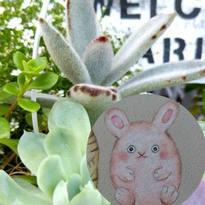 今日も危険な暑さです〜☀️😖 寄せ植えの中の月兎耳🐰さん セダムは伸び、多肉も1つ 溶けそうだけど、月兎耳さんは 元気いっぱいです〜( •̀ᴗ•́ )💖 前にトールペイントで描いた 十二支の中の、お目目くるりんの可愛い兎🐰さんを、見つけました〜(^ー^* )フフ♪💞 🏷毎月3日は耳の日に参加します〜(*˙˘˙*)ஐ