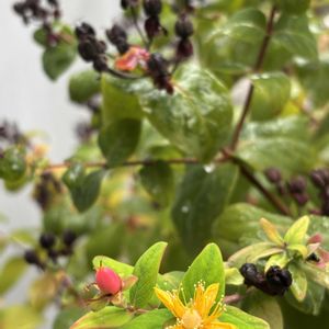 通勤路のヒペリカム。 寒くなって、「もう最後だよ」と言わんばかりの一輪。 赤、黄色、黒、3色の実が並びました。