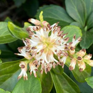 「富貴草」「吉事草」「吉祥草(キッショウソウ)」など縁起のよい名前 穂の下の部分に雌花、上の部分に雄花がつきます。学名のパキサンドラには「太い雄しべ」という意味があり、雄花の4本の白い雄しべが大きく目立。ごくたまに秋に白い実