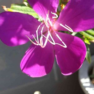 シコンノボタン💖 花の後方、蕾は結構あるのにひとつずつしか咲かない💦でも咲くとハッとする美しさです✨✨ 追記❗️ 調べたところによるとシコンノボタンは雌しべ、雄しべ共に紫色なんだそうで、 花の中央が白いこちらは改良品種である『コートダジュール』というノボタンのようです🙇♀️💦