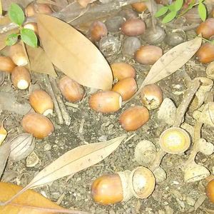 アカガシ(果実=ドングリ) 🌲🍎☘ 林を歩けばドングリが道に一杯落ちています。踏まずには進めません😓 このドングリは食べられるそうです🤔