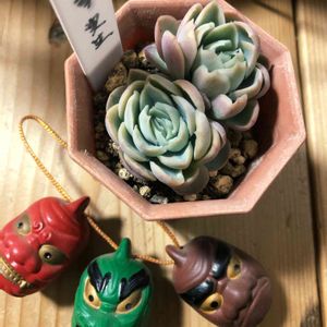今日は節分ですね〜 👹 🏷実生の日 に参加しつつ、鬼っぽい土鈴も一緒に。 2020年夏の自家受粉の白蓮華です。 現在、唯一の実生エケベリア。 4つ生き残ったうちの2つ、です。 ちゃんと白蓮華らしい顔つきだと思います🤗 ここには写ってませんが、のこり2つのうち、一つだけ、ちょっと違う雰囲気… 実生のなせる技なのか、たんに弱ってるだけなのか…🤔 鬼?達は、霧島神宮の魔除け土鈴なので、本当は鬼ではないのだと思いますが… 千と千尋の神隠しに出てくる顔だけのおじさん⁉️ 笑 に似てませんか? モデルかな?🙄